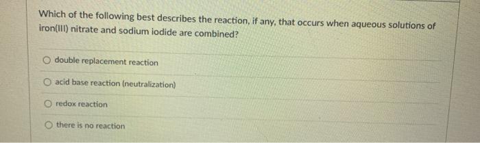 Question 11 3 points Which of the following best describes the reaction shown below. The salt formed is sodium acetate N a C 2 H 3 O 2. Which of the following best describes the reaction if any that occurs when aqueous solutions of ironIII nitrate and sodium iodide are combined.